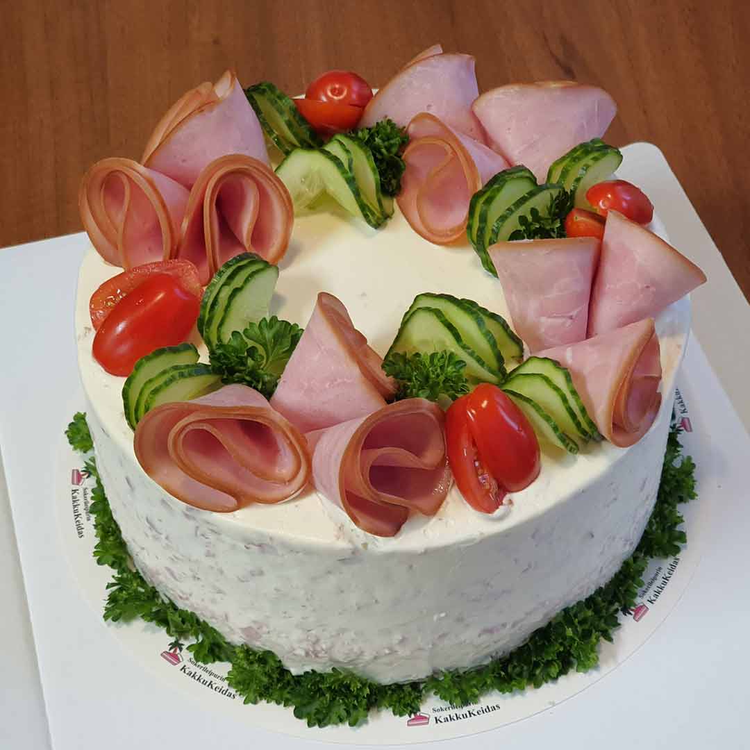 Voit valita voileipäkakkuusi lohitäytteen tai kinkkutäytteen. Valmistamme myös voileipäkakkujen leivät itse.